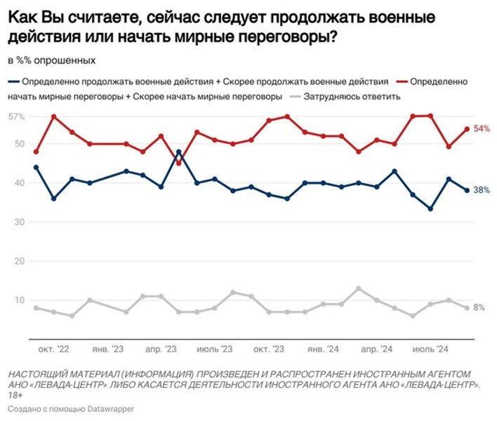 Результаты свидетельствуют, что за переговоры высказались 54% респондентов, что на 5% больше, чем в июле. Также против выступили 38%, что на 4% меньше, чем в июле.