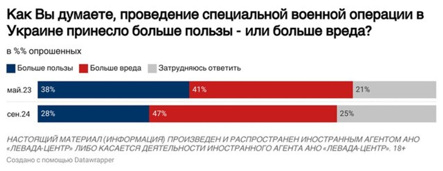 При этом 47% считают, что война в Украине наносит больше вреда, чем пользы, тогда как 28% придерживаются противоположного мнения.