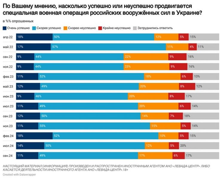 60% россиян считают, что "СВО" проходит успешно, тогда как 23% с этим не согласны.
