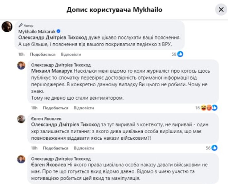 "Насколько мне известно, то когда журналист о ком-то что-то публикует, то сначала проверяет достоверность полученной информации от первоисточников. В конкретно данном случае Вы этого не делали. Почему не знаю. Поэтому неудивительно, что стали вентилятором. Никакого права гражданское лицо приказа давать военным не имеет. О том, что готовится вброс, известно давно. Известно с чьим участием и мотивацией делается этот вброс и манипуляция", — написал в комментариях под сообщением Макарука "Тихоход".