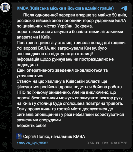 Вооруженные силы России атаковали Киев и область с применением ударных беспилотников. Об этом в среду, 16 октября, сообщает пресс-служба Киевской городской военной администрации (КГВА).