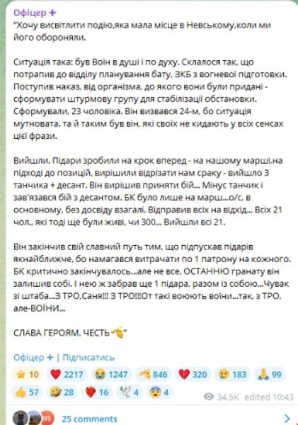 "БК критически заканчивался, последнюю гранату он оставил себе. И ею же забрал еще 1 п**ара, вместе с собой. Чувак из штаба. С ТРО, Саня! С ТРО! Вот такие воюют воины, да, с ТРО, но — воины", — резюмировал "Алекс".
