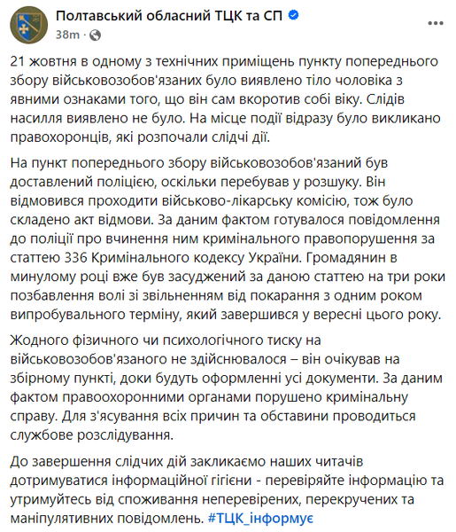 "21 октября в одном из технических помещений пункта предварительного сбора военнообязанных было обнаружено тело мужчины с явными признаками того, что он сам покончил с собой. Следов насилия обнаружено не было", — говорится в заявлении ТЦК.