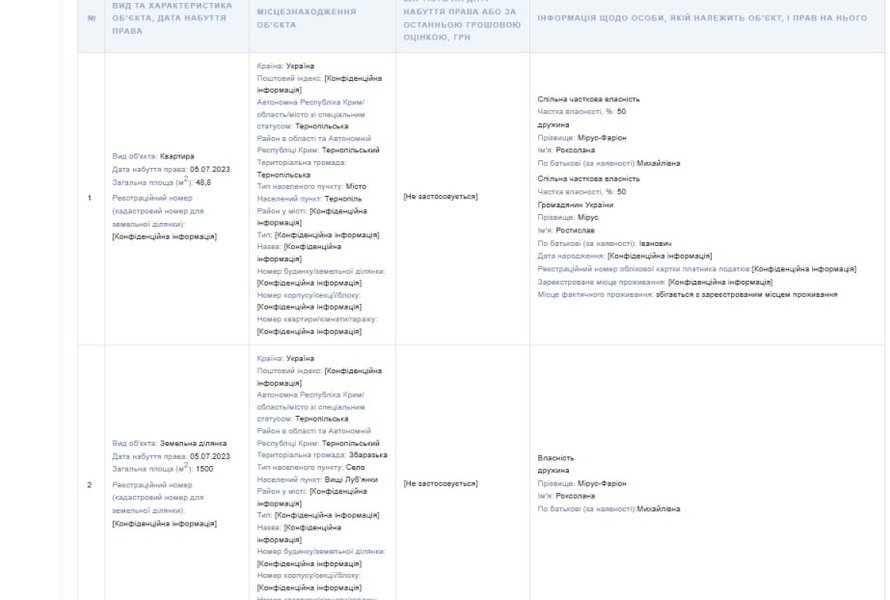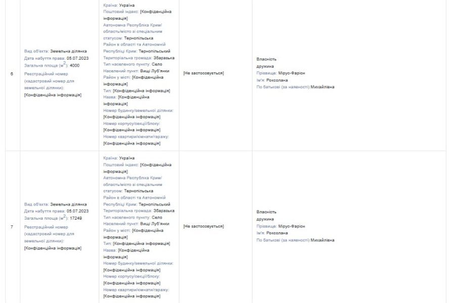 После этого в его декларации уже за 2023 год оказалось, что 5 июля 2023 года, жена Роксолана Мирус-Фарион, за один день стала обладательницей — квартиры, дома и пяти земельных участков на несколько гектаров.