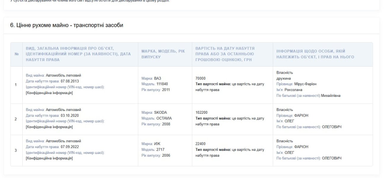 В частности, в своей декларации за 2022 год Фарион указал, что имеет три авто: ВАЗ, SKODA и ИЖ-2717, 5 тысяч долларов своих сбережений и 10 тысяч — жены и получает врачебную зарплату в размере 271 тысяча и 389 тыс грн зарплата жены за год.