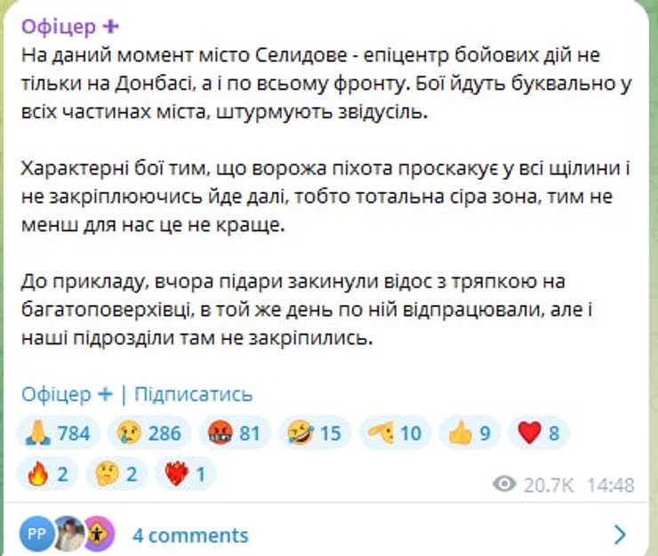 Сейчас город Селидово — эпицентр боевых действий не только на Донбассе, а и по всему фронту. Бои идут буквально во всех частях города, ВС РФ штурмуют отовсюду. Об этом в своем телеграм-канале "Офицер+" сообщил лейтенант ВСУ с позывным "Алекс".