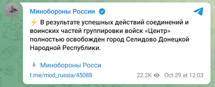 "В результате успешных действий соединений и воинских частей группировки войск "Центр" полностью освобожден город Селидово Донецкой Народной Республики", — говорится в сообщении оборонного ведомства страны-агрессора.