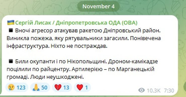 Ночью 4 ноября ВС РФ атаковали Днепропетровскую область баллистической ракетой.