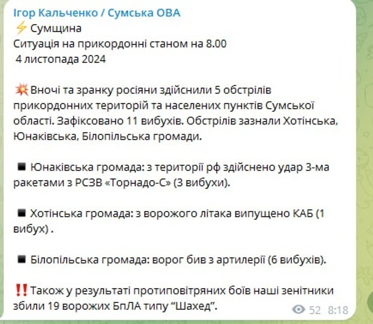 Отмечается, что враг из РСЗО бил по территории Юнаковской громады, КАБом по Хотинской, из артиллерии по Белопольской громаде.