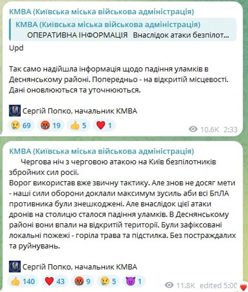 "В результате атаки беспилотников РФ на Киев предварительно зафиксировано падение обломков в Оболонском районе столицы. Так же поступила информация о падении обломков в Деснянском районе. Предварительно — на открытой местности. Враг использовал уже привычную тактику. Но вновь не достиг цели — наши силы обороны приложили максимум усилий, чтобы все БпЛА противника были обезврежены", — сообщил председатель КГВА Сергей Попко.