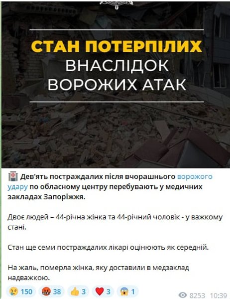 Всего в результате вчерашнего ракетного удара по Запорожью погибли восемь человек, 25 получили ранения.