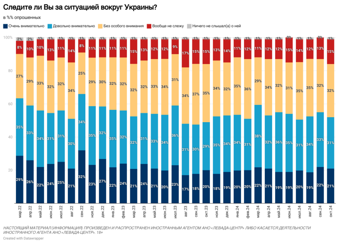 Отмечается, что россияне и дальше следят за событиями в Украине — 52% респондентов ответили, что "следят внимательно" и "очень внимательно". Треть опрошенных (32%) следит без особого внимания, 15% не следят совсем.