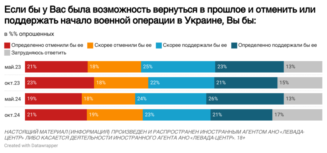 Мнения россиян разделились по вопросу о том, отменили ли они отменили или поддержали начало так называемой "спецоперации", если бы у них была возможность вернуться в прошлое: 40% — отменили бы (21% определенно отменили, 19% скорее отменили), 44% — поддержали бы (21% — определенно поддержали, 23% — скорее поддержали). За полтора года общественное мнение по этому вопросу не претерпело значительных изменений.