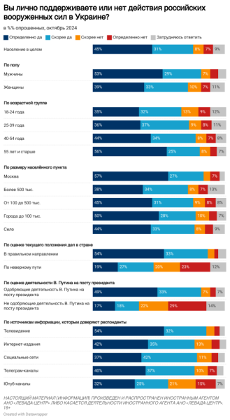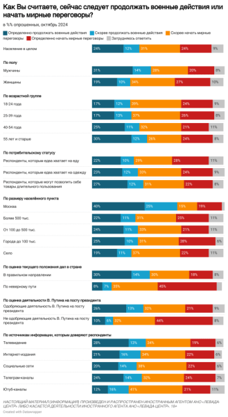 После снижения доли сторонников мирных переговоров на фоне захвата ВСУ части Курской области их количество постепенно увеличивается — до 55%. Доля сторонников продолжения боевых действий снижается — до 36%.