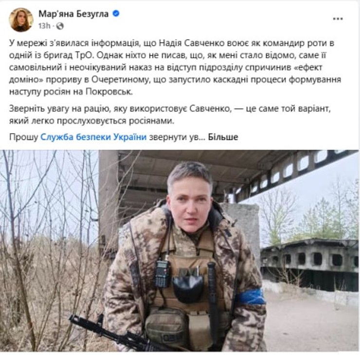 "В сети появилась информация, что Надежда Савченко воюет как командир роты в одной из бригад ТрО. Однако никто не писал, что, как мне стало известно, именно ее самовольный и неожиданный приказ на отступление подразделения вызвал "эффект домино" прорыва в Очеретино, что запустило каскадные процессы формирования наступления россиян на Покровск. Обратите внимание на рацию, которую использует Савченко, — это именно тот вариант, который легко прослушивается россиянами", — написала Безуглая.