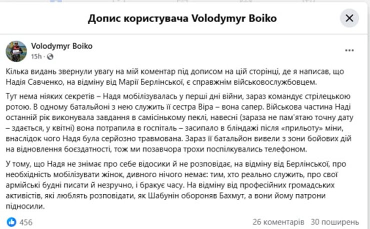 Отдельных пользователей сети возмутил пост Безуглой. Так, журналист Владимир Бойко встал на защиту Надежды Савченко и заявил, что экс-депутат является настоящей военной и в отличие от диванных экспертов действительно воюет.