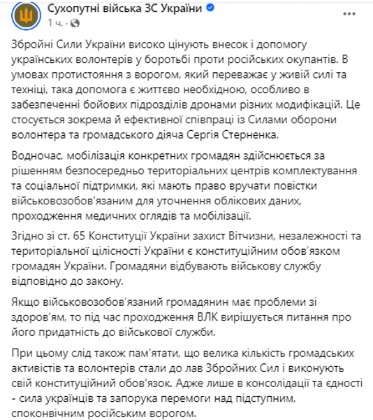Волонтеры также выполняют конституционный долг: в ВСУ прокомментировали ситуацию со Стерненко