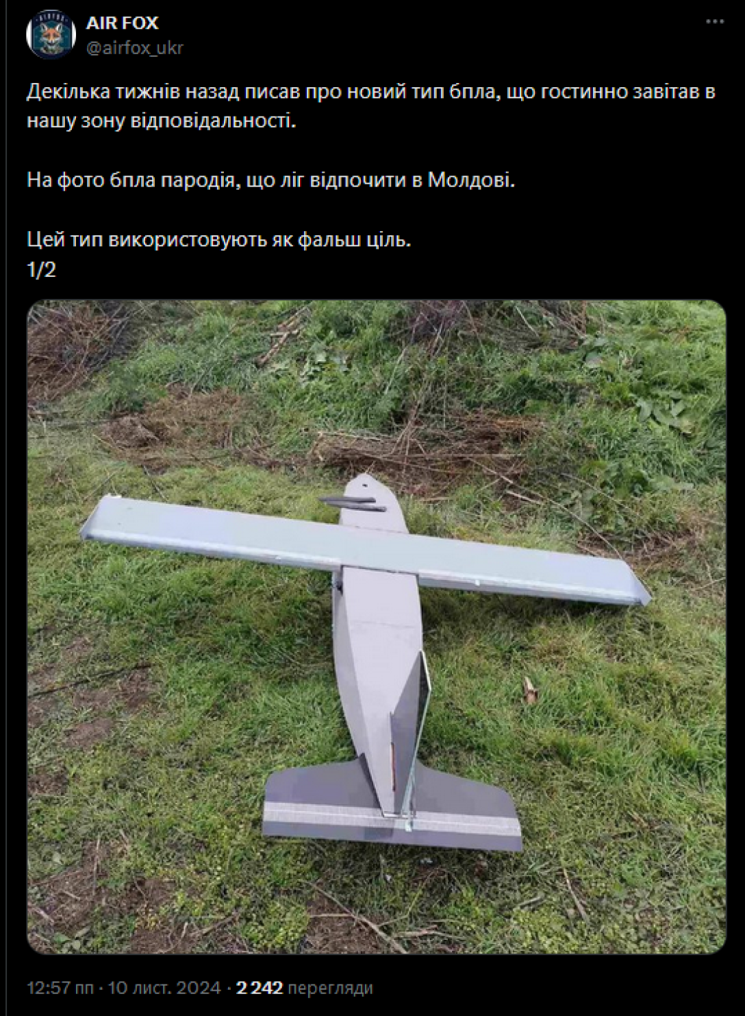 "Несколько недель назад писал о новом типе БПЛА, который гостеприимно посетил нашу зону ответственности. На фото БПЛА "Пародия", который лег отдохнуть в Молдове. Этот тип используют как фальшь цель. Он дешев, а это и является главным критерием. А еще маленький вес помогает сделать дальний трип. Это в двух словах", – написал он.