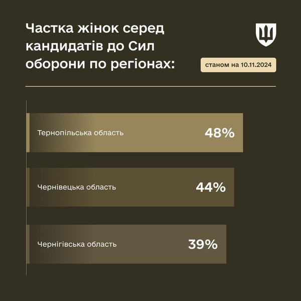 Больше всего женщин обращаются в рекрутинговые центры в Тернопольской, Черновицкой и Черниговской областях. В среднем по стране доля женщин составляет 19% среди всех кандидатов.