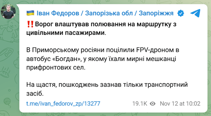 В Приморском районе на Запорожье российские оккупанты атаковали FPV-дроном пассажирский автобус, в котором ехали жители прифронтовых сел. Об этом сообщил председатель Запорожской областной военной администрации Иван Федоров во вторник, 12 ноября.
