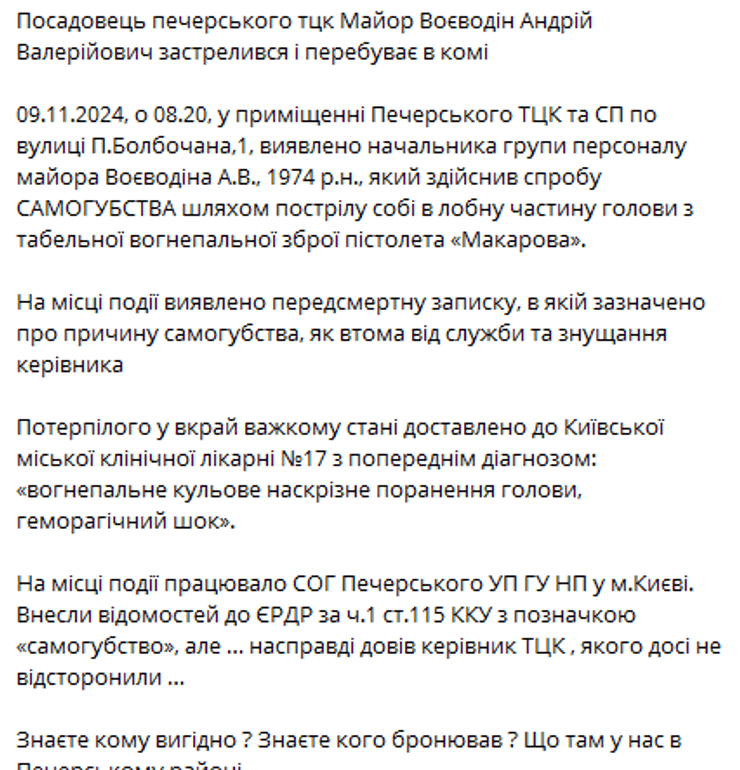 Собеседник издания рассказал, что утром в субботу, 9 ноября, в помещении ТЦК и СП был обнаружен раненым майор Воеводин, начальник группы персонала. По предварительной информации, мужчина совершил попытку самоубийства, выстрелив себе в голову из пистолета.