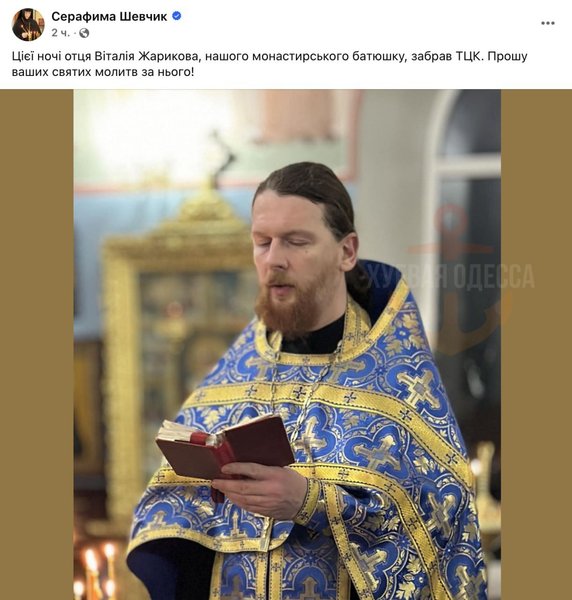 "Этой ночью отца Виталия Жарикова, нашего монастырского батюшку, забрал ТЦК. Прошу ваших святых молитв за него", — написала она.