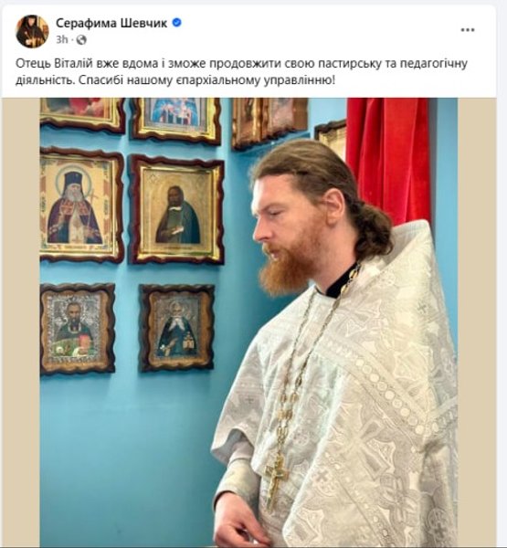 "Отец Виталий уже дома и сможет продолжить свою пастырскую и педагогическую деятельность. Спасибо нашему епархиальному управлению", — написала Серафима Шевчик через несколько часов.