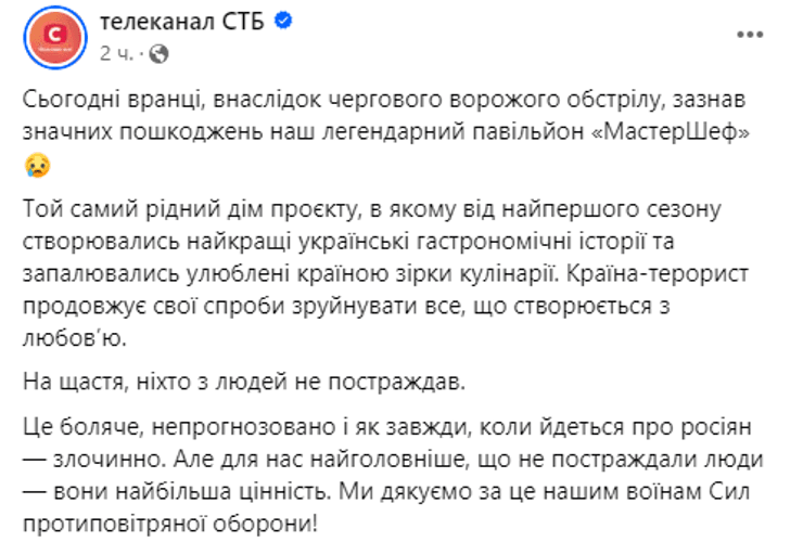 В среду утром 13 ноября, в результате вражеского обстрела значительные повреждения получил съемочный павильон, в котором создают популярное украинское кулинарное шоу "МастерШеф". Об этом сообщает телеканал "СТБ".