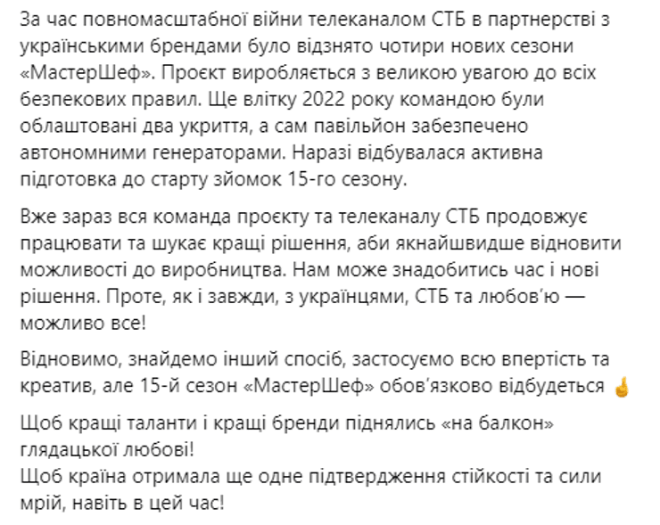 "Страна-террорист продолжает свои попытки разрушить все, что создается с любовью", — отметили в "МастерШеф".