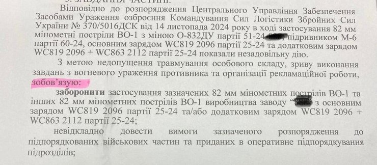 Проблема с некачественными боеприпасами в украинской армии касается не только мин калибра 120 мм, но и минометных снарядов калибра 82 мм. Об этом сообщила в Facebook корреспондент "ТСН" Юлия Кириенко, обнародовав фрагмент официального распоряжения об изъятии таких мин с передовой.