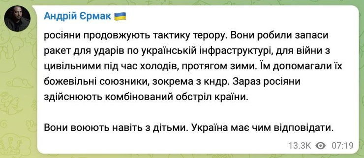 "Россияне продолжают тактику террора. Они делали запасы ракет для ударов по украинской инфраструктуре, для войны с гражданскими во время холодов, в течение зимы. Им помогали их сумасшедшие союзники, в частности из КНДР. Сейчас россияне осуществляют комбинированный обстрел страны. Они воюют даже с детьми. Украине есть чем отвечать", — отметил Андрей Ермак.
