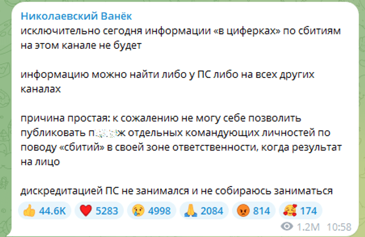 Автор канала-миллионника "Николаевский Ванек" отказался перепечатывать официальную сводку Воздушных Сил о пораженных целях после атаки россиян. По его словам, он не может себе позволить публиковать ложь.