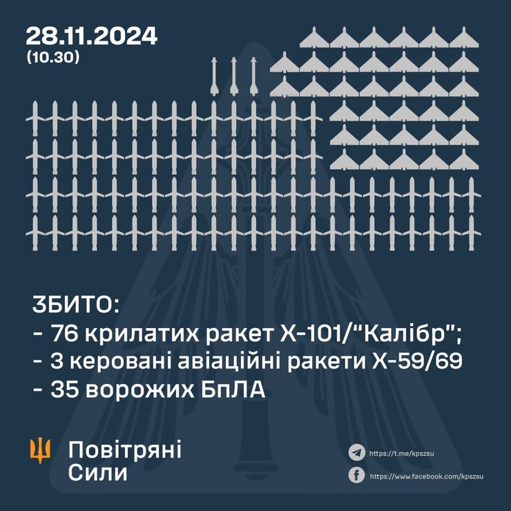 В Воздушных Силах сообщили, что в целом противник выпустил по Украине 188 средств нападения, из которых было сбито 111 целей, в том числе 76 из 85 крылатых ракет, 3 управляемые авиаракеты и ️35 из 97 "шахедов". При этом, как отмечается, еще 62 беспилотника были локально потеряны.
