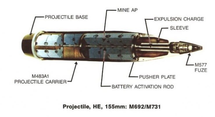 Если кратко, то оружие представляет собой 155-мм боеприпас, который оснащен противопехотными минами M67 (с 4 часами самоликвидации) или M72 (48 часов самоликвидации).