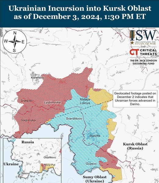 На фоне продолжающихся боев украинские силы добились прогресса на южной части выступа в Курской области. Геолокационные кадры подтверждают продвижение Украины в районе южной части Дарьино, к юго-востоку от Коренево.