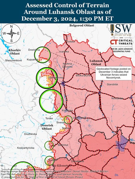 Украинские войска успешно отбили попытку российских сил закрепиться на правом берегу реки Оскол в районе Новомлинска, что к северу от Купянска. Геолокационные кадры, опубликованные 3 декабря, подтвердили контроль Украины над этим населенным пунктом, несмотря на недавние заявления российской стороны о продвижении в этом районе. Об этом сообщили аналитики Института изучения войны (ISW).