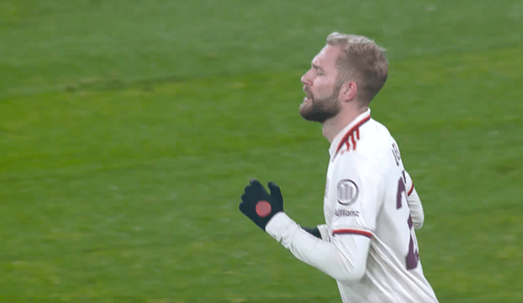 31. Судаков решил обыграть мюнхенцев в своей штрафной площади и упал. Судья зафиксировал фол на полузащитнике. Но автор забитого мяча протестует.