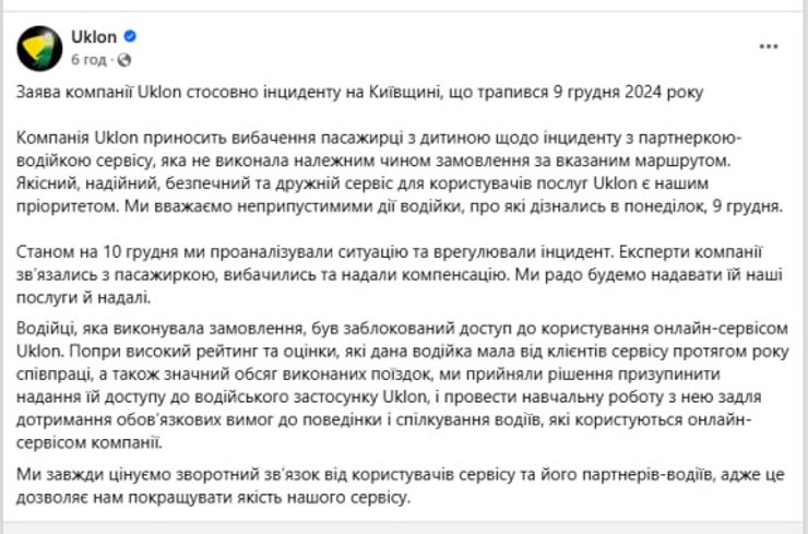 "Компания Uklon приносит извинения пассажирке с ребенком относительно инцидента с партнершей-водителем сервиса, которая не выполнила должным образом заказ по указанному маршруту. Мы считаем недопустимыми действия водителя. По состоянию на 10 декабря мы проанализировали ситуацию и урегулировали инцидент. Водителю, которая выполняла заказ, был заблокирован доступ к пользованию онлайн-сервисом Uklon", — говорится в сообщении.