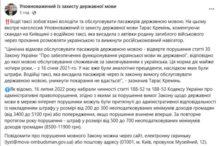 Уполномоченный по защите государственного языка Тарас Креминь отреагировал на инцидент в Киевской области с водителем такси, которая высадила из машины семью погибшего военного из-за просьбы разговаривать на украинском и выключить русскоязычный навигатор. Он заявил, что водители такси обязаны владеть и обслуживать пассажиров на государственном языке.