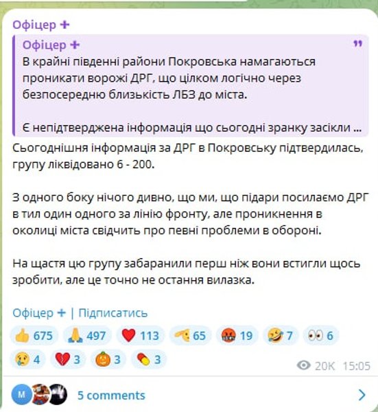 "Сегодняшняя информация по ДРГ в Покровске подтвердилась, группа ликвидирована 6 — 200. С одной стороны ничего удивительно, что мы, что п**ары посылаем ДРГ в тыл друг друга за линию фронта, но проникновение в окрестности города свидетельствует об определенных проблемах в обороне", — отметил он.
