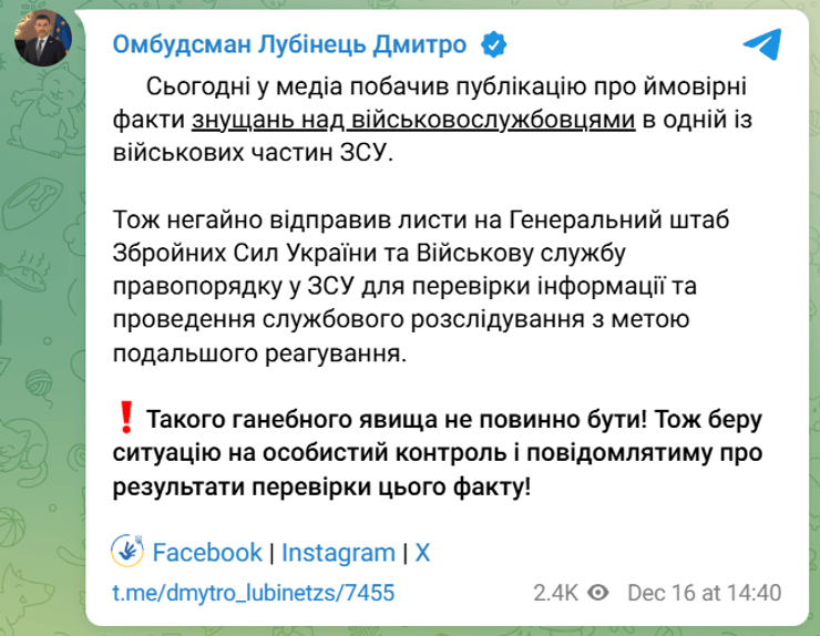 Уполномоченный Верховной Рады Украины по правам человека Дмитрий Лубинец одним из первых отреагировал на скандал в 211-й ПМБр. Он обратился в Генеральный штаб ВСУ и Военную службу правопорядка с просьбой проверить информацию об издевательствах над военнослужащими.