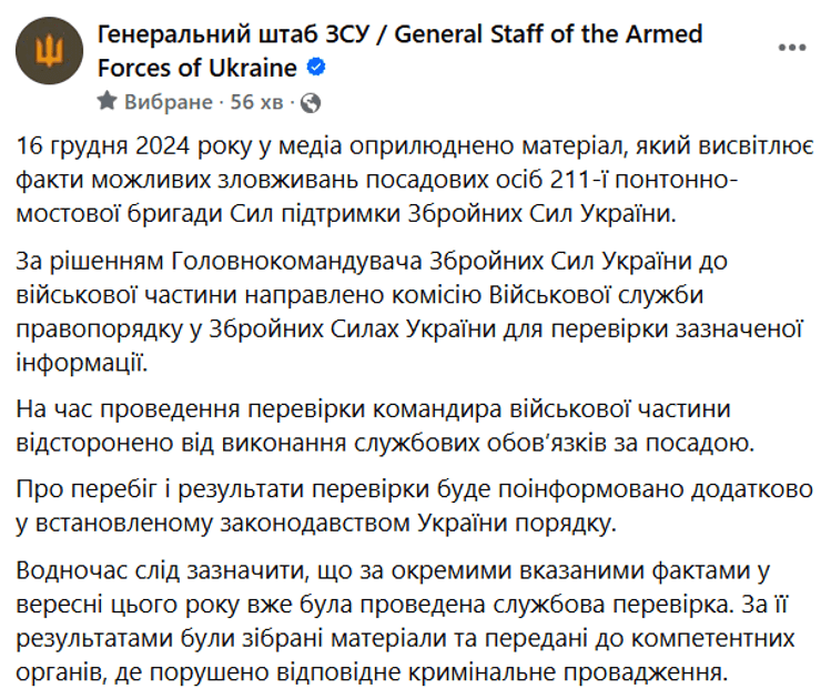 В понедельник, 16 декабря, журналисты опубликовали материал о фактах злоупотреблений должностных лиц 211-й понтонно-мостовой бригады Сил поддержки Вооруженных Сил Украины. В частности речь идет об издевательствах над военными, вымогательстве взяток и другом. На материал "Украинской правды" отреагировали в Генштабе ВСУ, Минобороны и Офисе омбудсмена. Главнокомандующий ВСУ Александр Сырский направил комиссию Военной службы правопорядка для проверки обнародованной информации.