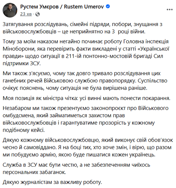 "Мы также выясним, почему так долго длилось расследование этих позорных вещей Военной службой правопорядка. Общество ожидает объяснений, почему ситуация не была решена раньше. Моя позиция как министра четкая: все виновные должны понести наказание", — написал Умеров в Facebook.