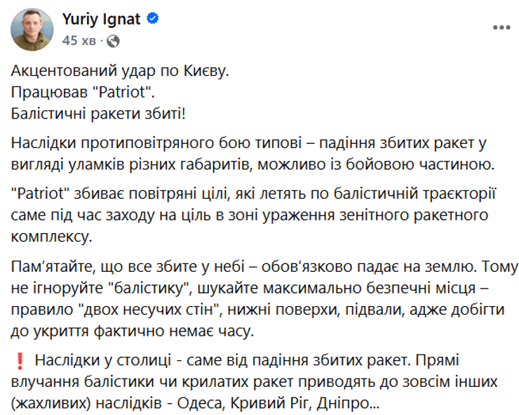 Он отметил, что в Киеве повреждения вызваны именно падением обломков сбитых ракет. Игнат отметил, что прямые попадания баллистических или крылатых ракет, как это было раньше в Одессе, Кривом Роге или Днепре, приводят к гораздо более тяжелым последствиям.