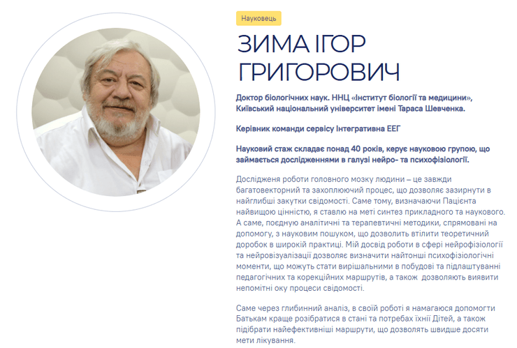 Игорь Зима — доктор биологических наук. Имел более 40 лет научного стажа и преподавал в "Институте биологии и медицины" Киевского национального университета имени Тараса Шевченко. Он руководил научной группой, занимающейся исследованиями в области нейро- и психофизиологии.