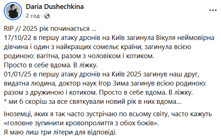 "01/01/25 в первую атаку дронов на Киев 2025 погиб наш друг, выдающийся человек, доктор наук Игорь Зима погиб всей семьей: вместе с женой и котиком. Просто у себя дома. В постели. Мы бы скорее всего праздновали новый год у них дома...", — написала женщина.