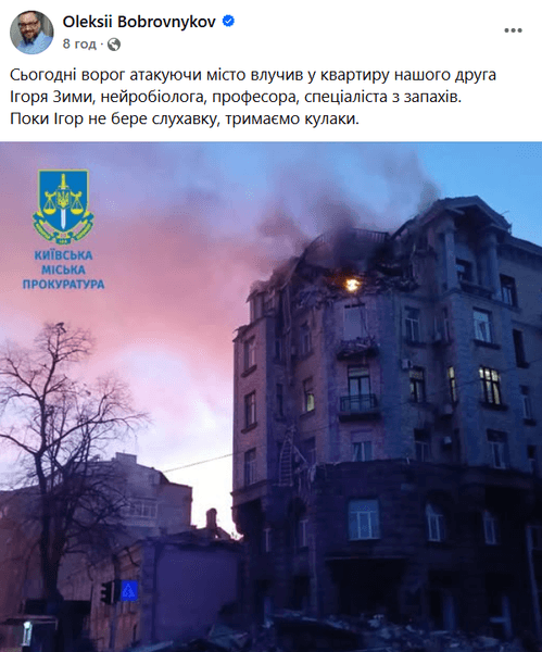 "Сегодня враг атакуя город попал в квартиру нашего друга Игоря Зимы, нейробиолога, профессора, специалиста по запахам. Пока Игорь не берет трубку, держим кулаки", — отметил Бобровников.