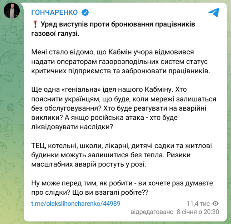 Народный депутат Украины от фракции "Европейская солидарность" Алексей Гончаренко заявил, что Кабинет министров Украины якобы отказался предоставлять операторам газораспределительных систем статус критических предприятий, что делает невозможным бронирование их работников. Об этом парламентарий сообщил в своем Telegram в среду, 8 января.