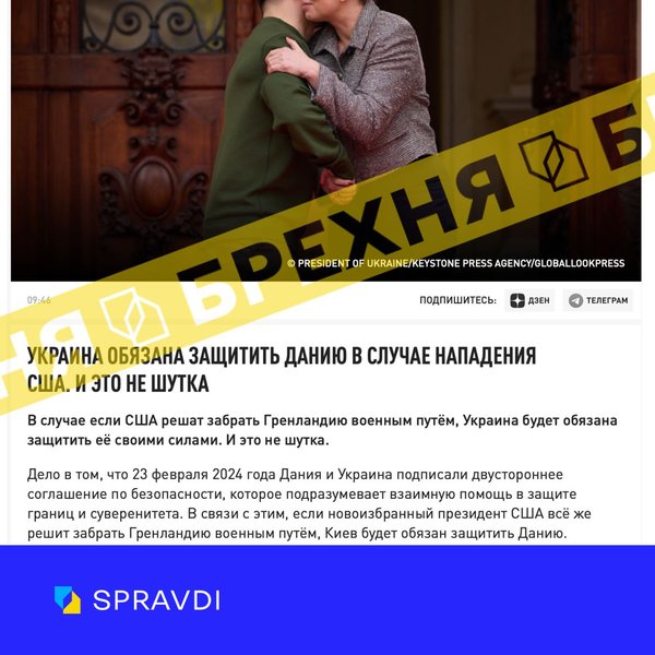 Российские СМИ сообщили о том, что якобы Украина обязана защитить Данию, если США нападут на Гренландию, поскольку страны подписали соглашение о безопасности 23 февраля 2024 года. Однако это вражеская выдумка, отметили в Центре противодействия дезинформации при СНБО в Telegram.