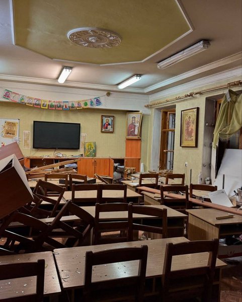 Обломками повреждена крыша сооружения, посечены окна и изуродованы учебные комнаты. Верующие собрались на территории храма и собирают обломки.